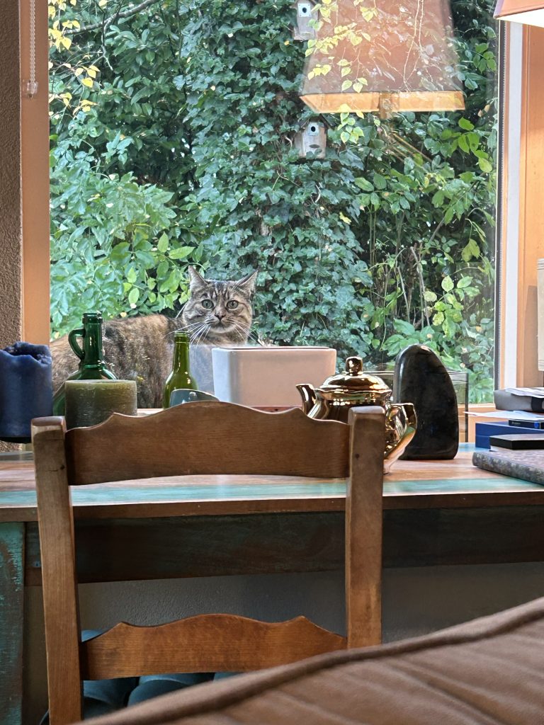Foto: Snuutje wil weer naar binnen vanaf mijn vensterbank, terwijl ik net ben gaan zitten…! Ons dagelijks tafereel dat ik nu gelukkig nooit meer hoef te missen!